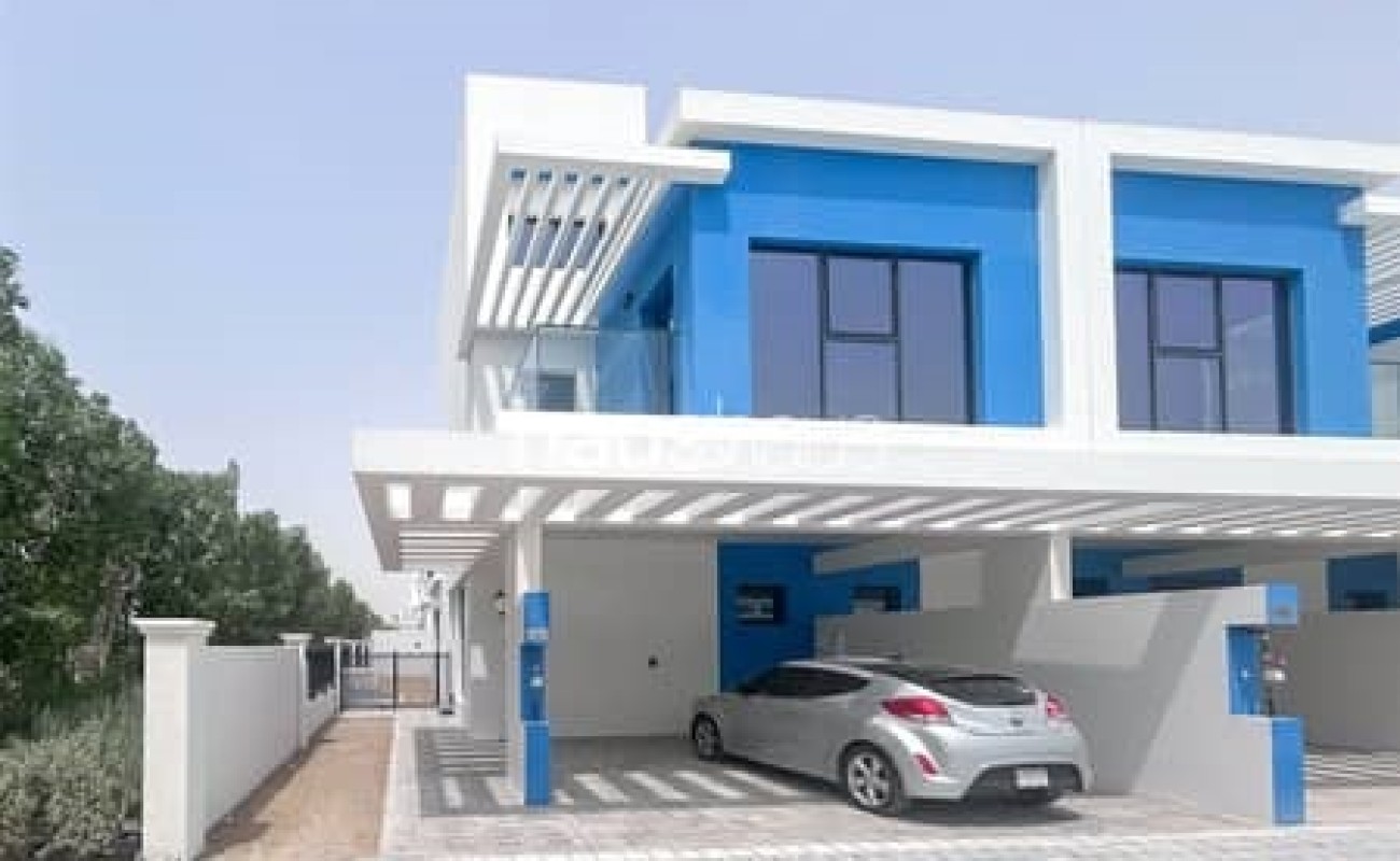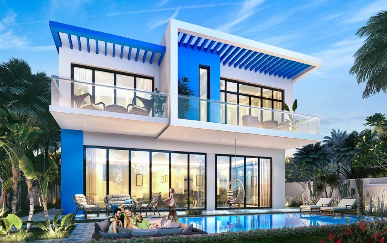 Stunning 5-bedroom villa in the Santorini district of Damac Lagoons. This villa offers a modern, elegant design with spacious living areas, high-end finishes, and large windows that bring in natural light.